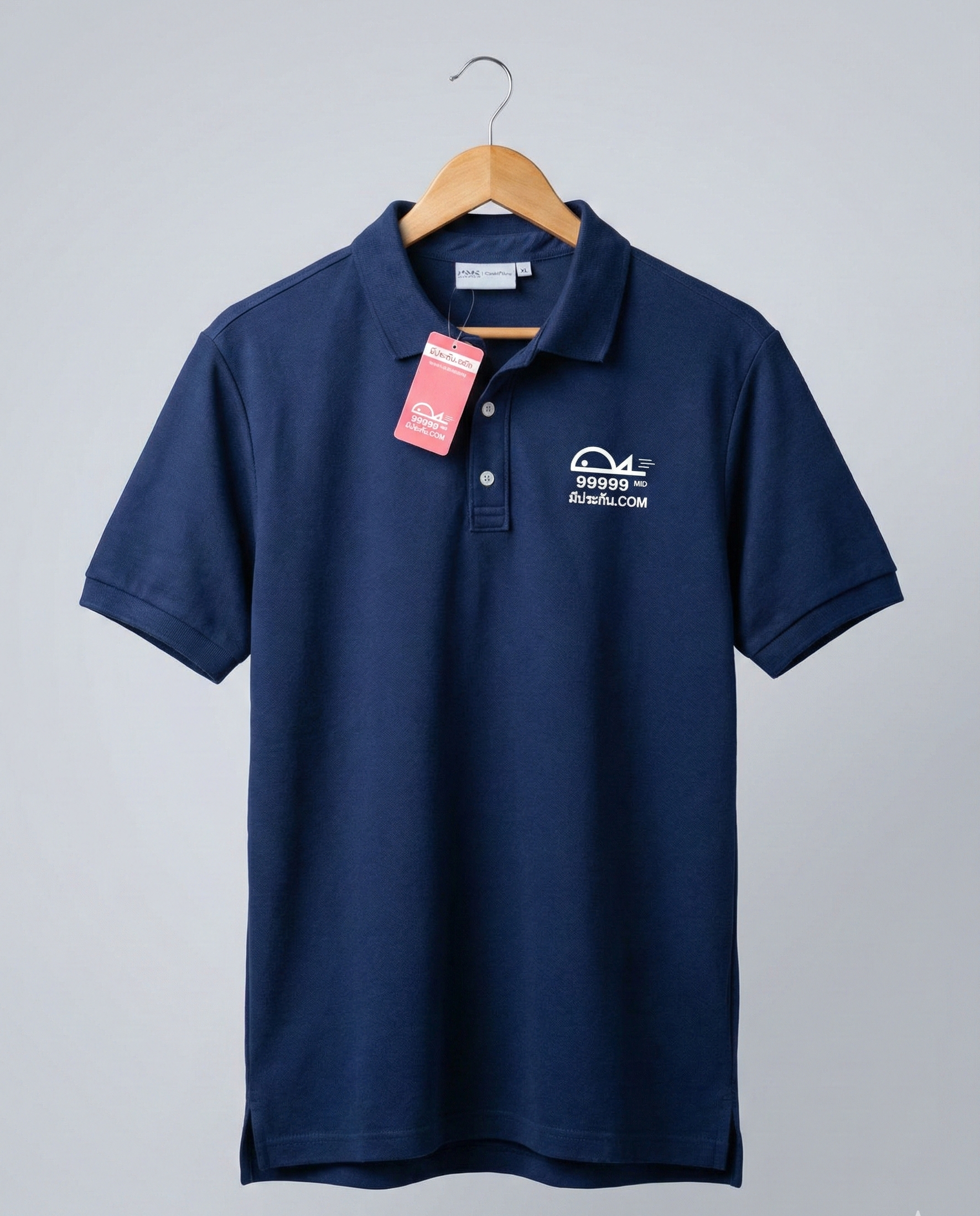 สินค้า : เสื้อโปโล พร้อมปักโลโก้รูปปลาวิ่ง + หมายเลข MID + ชื่อเว็บไซต์ “มีประกัน.com”